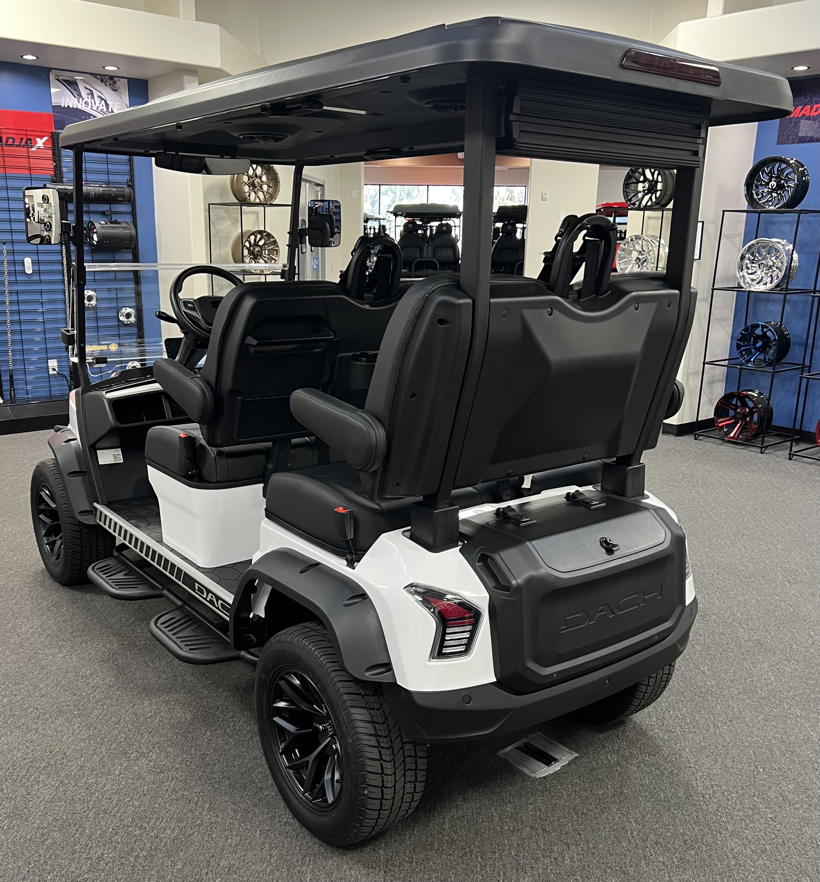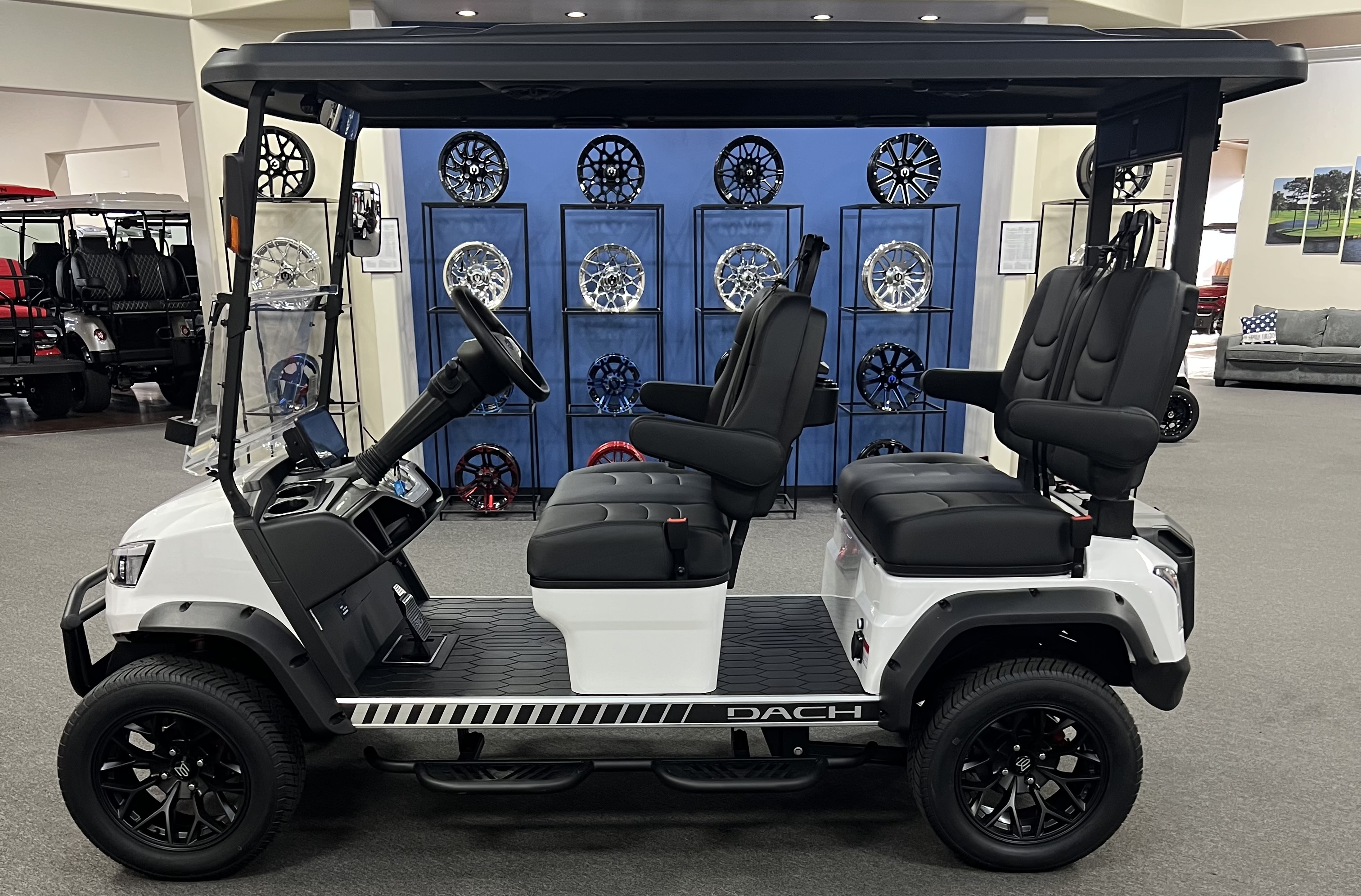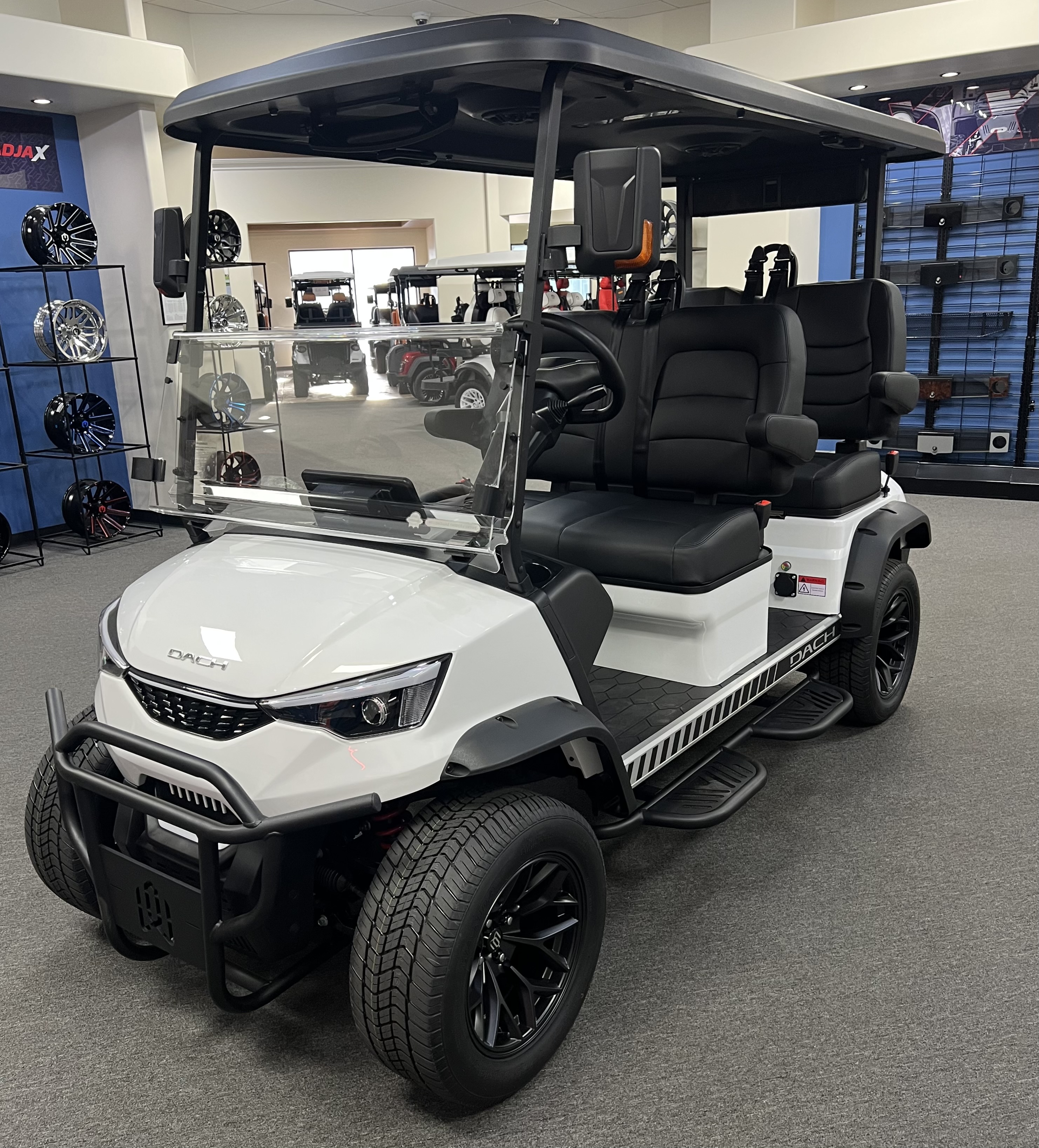 DACH 2025 Apollo Rider 4: 4 Seat Forward Facing Golf Cart, 72V/105AH Lithium Battery, 12.3” Touch Screen, Backup camera,Apple/Andriod Carplay, Bluetooth soundbar, Roof Lining includes 2- 6 ½” speakers, Ambient lights, Roof logo light, High mounted brake lights, Cruise control ( YES Cruise control) Tilt steering, Wireless phone charging, Turn signal side mirrors, Front LED headlights, Running boards, Push Button Start, Folding armrests, Premier seats, Front push bar, Steering wheel radio controls, 4-wheel Disc brakes, and much more. , We Also Have a Full Line of Accessory Upgrades Along with Financing Available.
