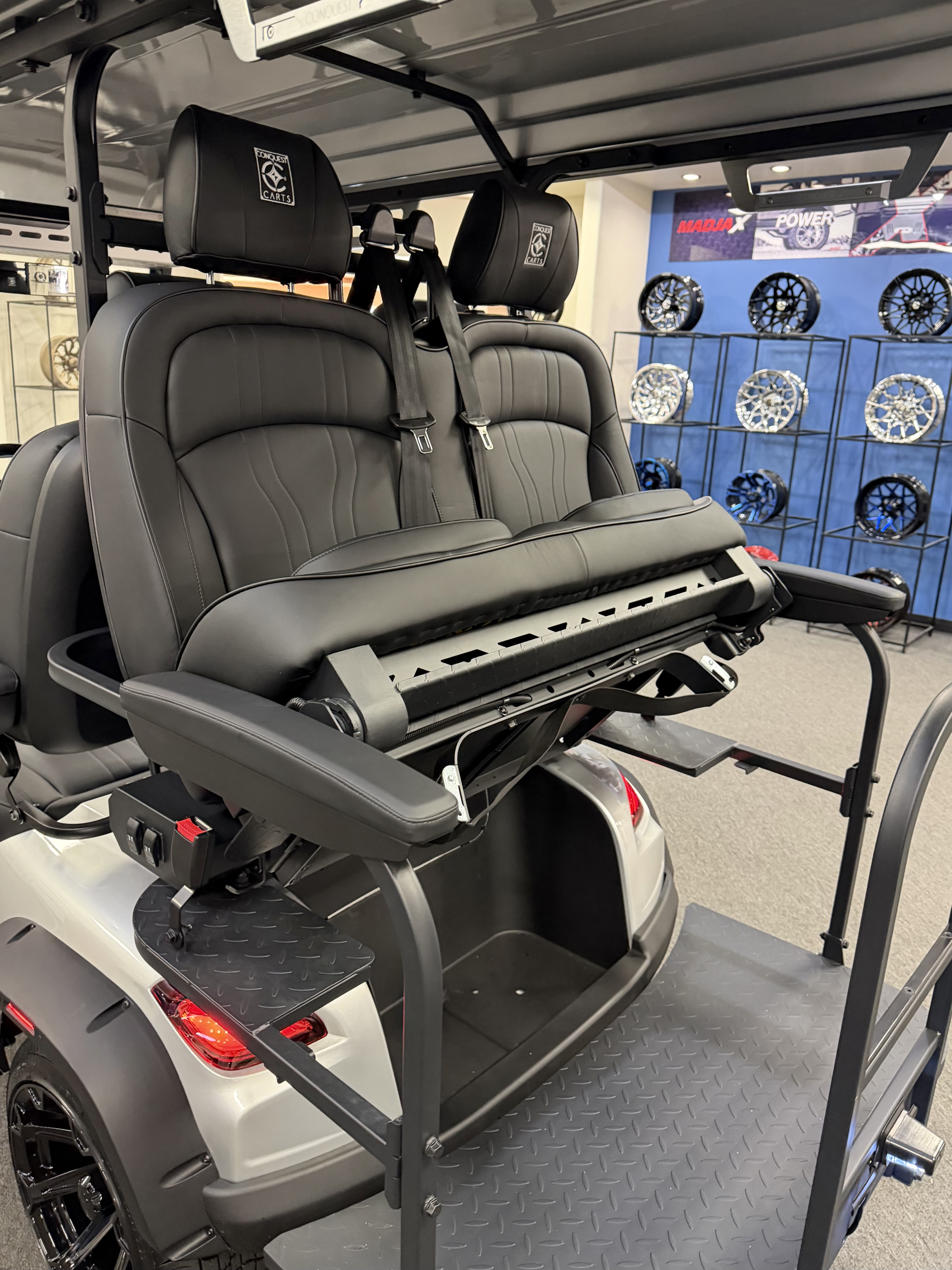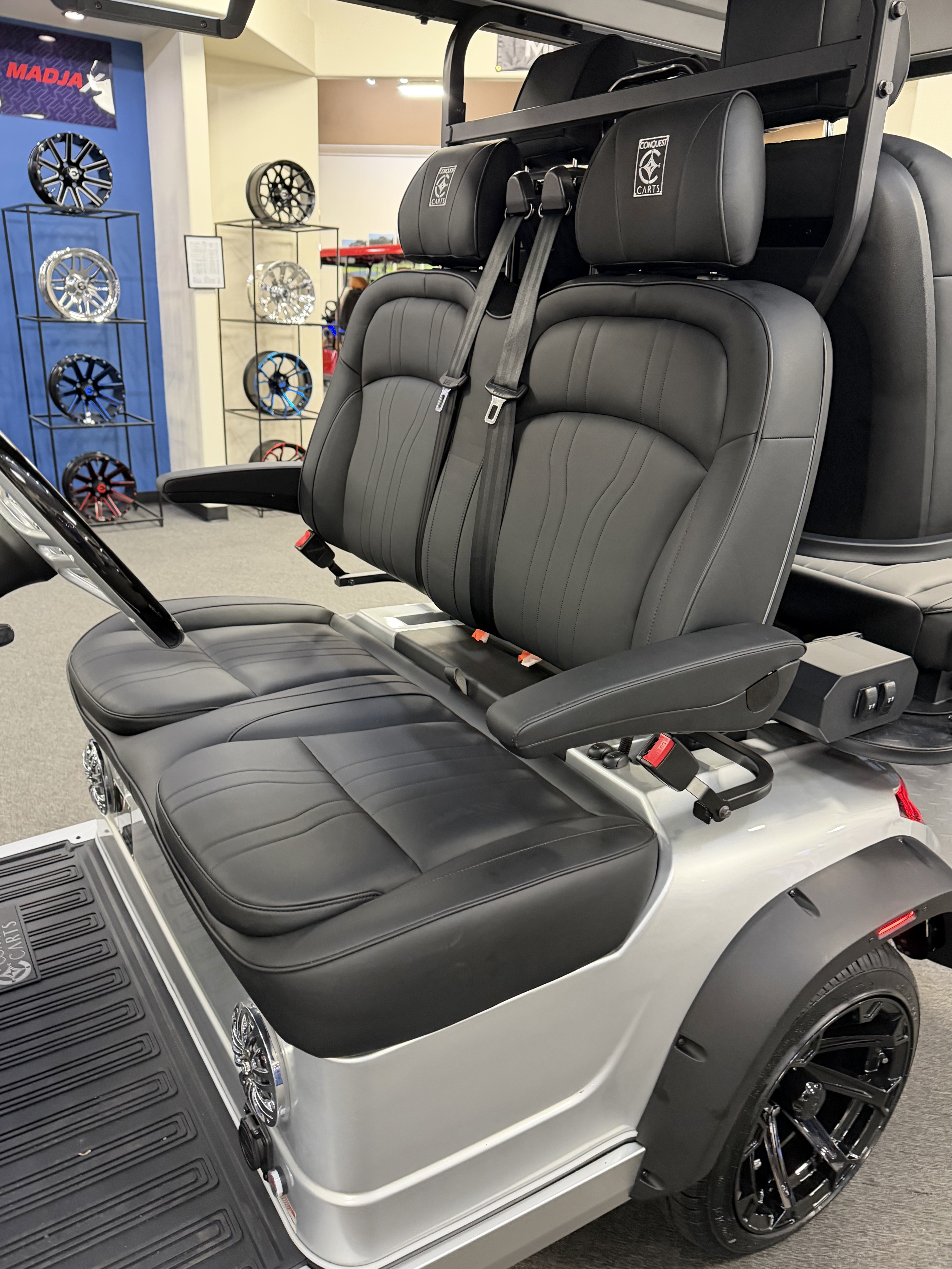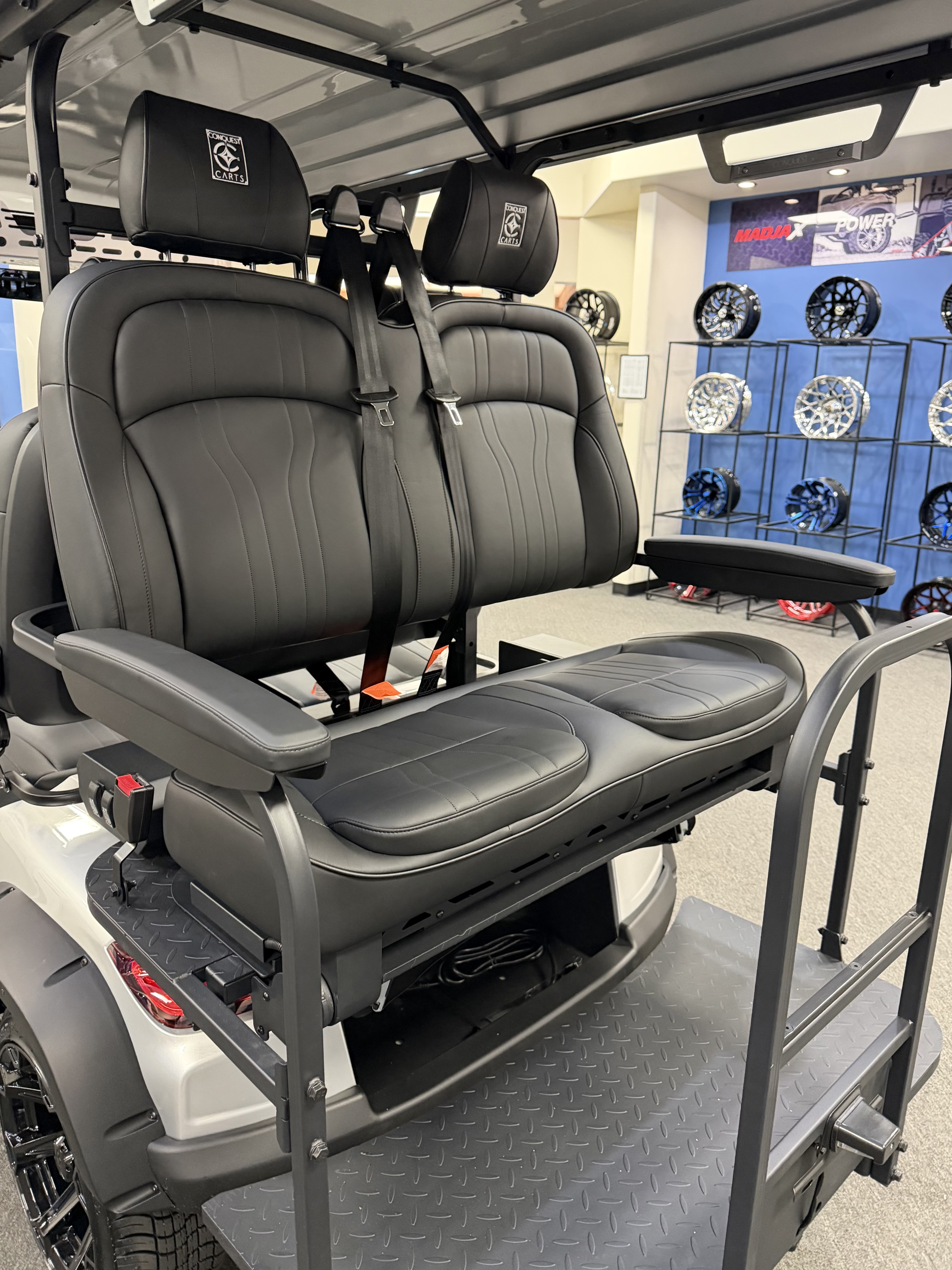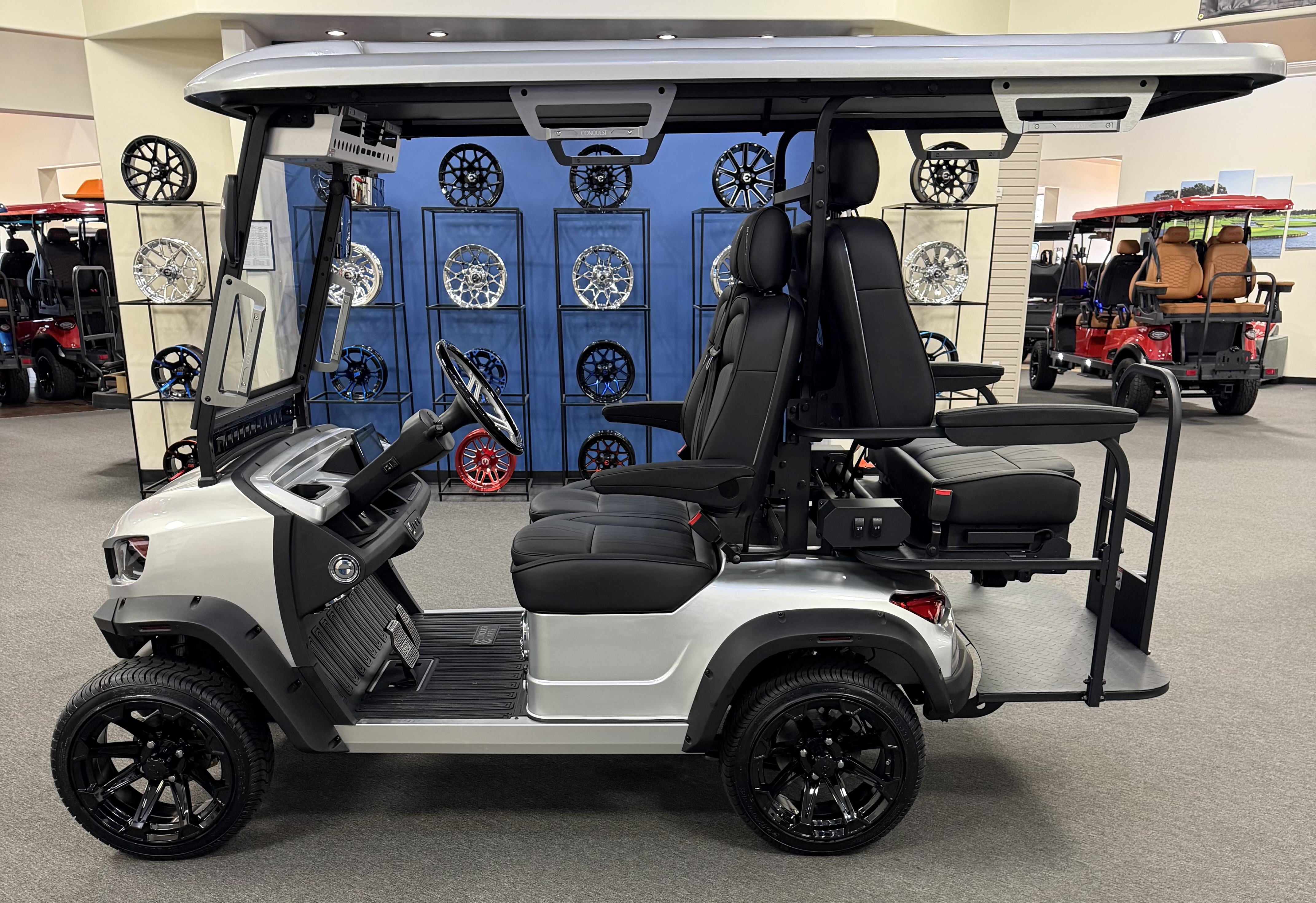 2026 Conquest S40, Lithium Battery ( 5 Year Full Replacement ), 10” Rotating Entertainment Touch Screen, Backup Camera, Apple/Android Carplay, Wireless Phone Charging, Voice Controlled Ambient Lights, Power Rear Lifting Seat With Golf Bag Package, LED Side Mirrors, 4 Mount Speakers with Subwoofer, Keyless/Push Button Start, Heated Front Seats, Power Adjustable Steering Wheel, Adjustable Arm Rest, In-dash Umbrella Holder, Custom 14” Wheels.