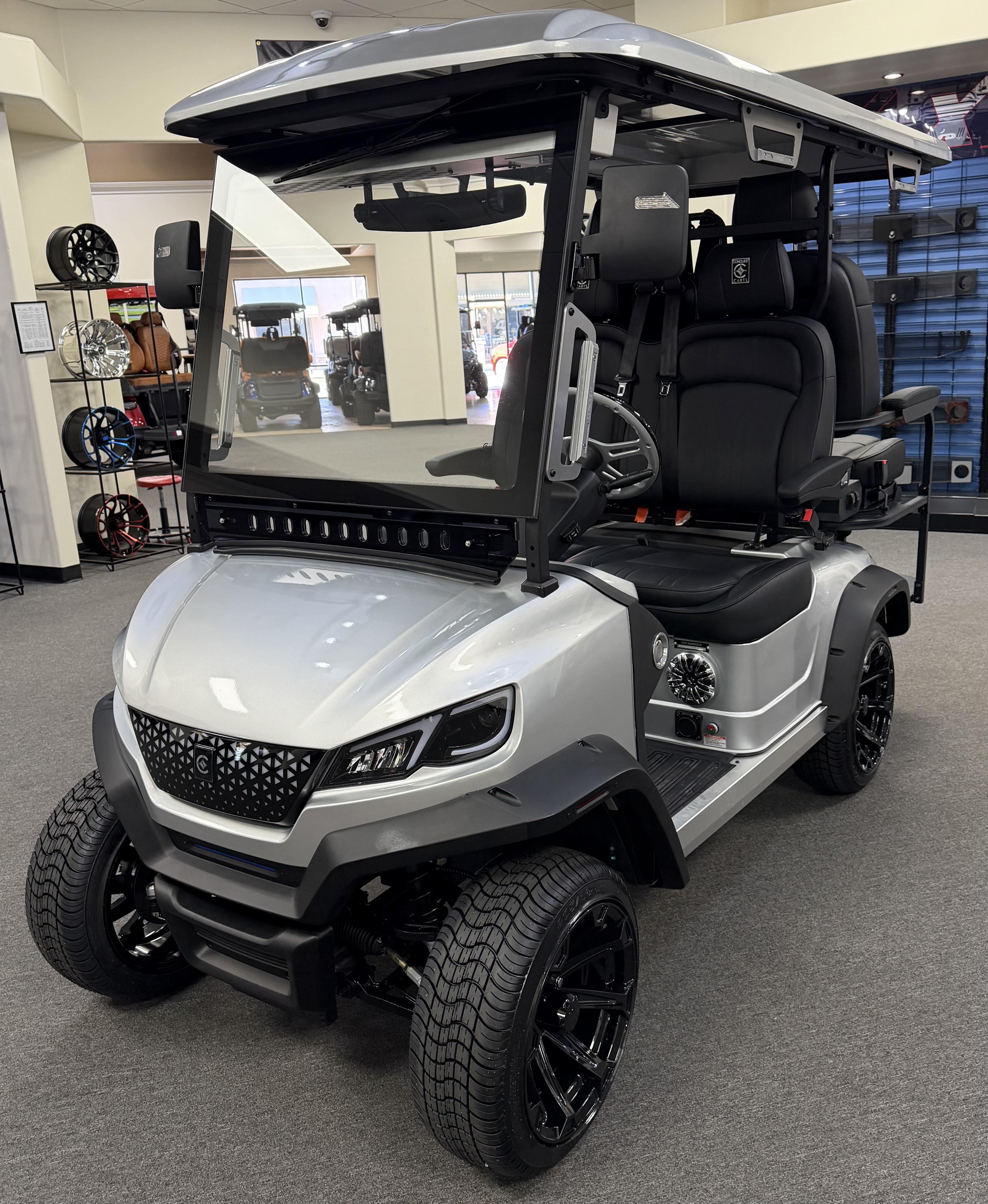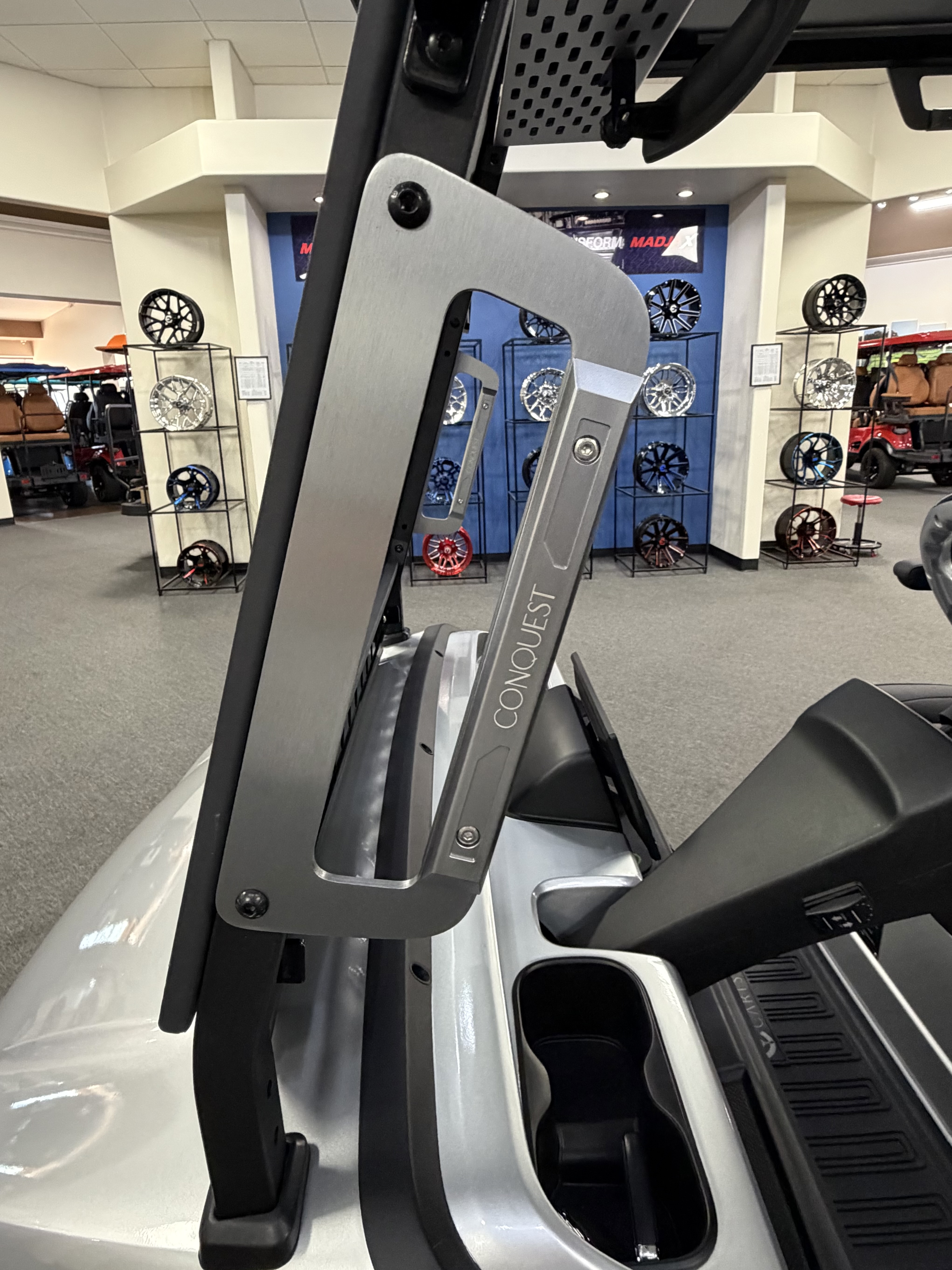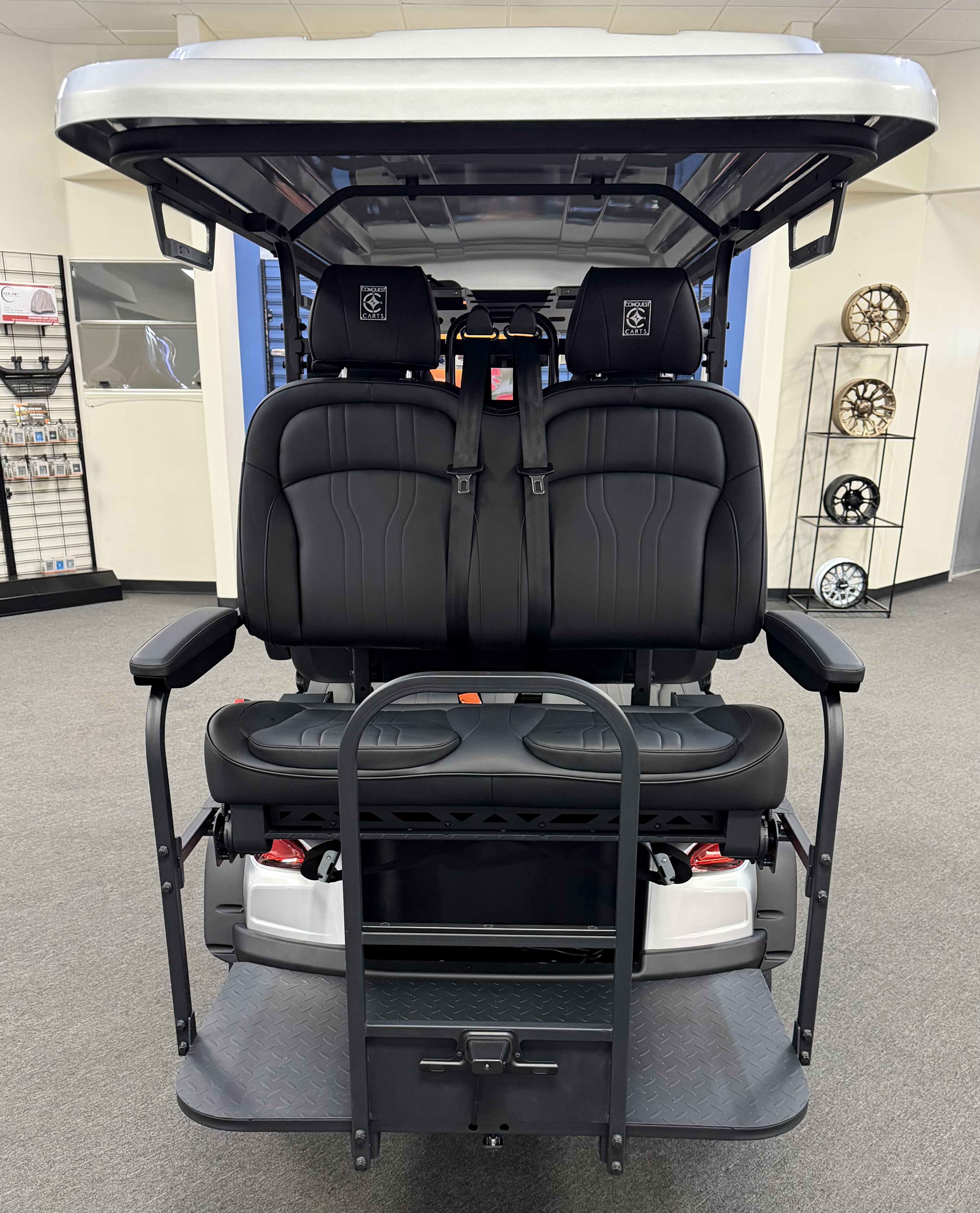 2026 Conquest S40, Lithium Battery ( 5 Year Full Replacement ), 10” Rotating Entertainment Touch Screen, Backup Camera, Apple/Android Carplay, Wireless Phone Charging, Voice Controlled Ambient Lights, Power Rear Lifting Seat With Golf Bag Package, LED Side Mirrors, 4 Mount Speakers with Subwoofer, Keyless/Push Button Start, Heated Front Seats, Power Adjustable Steering Wheel, Adjustable Arm Rest, In-dash Umbrella Holder, Custom 14” Wheels.