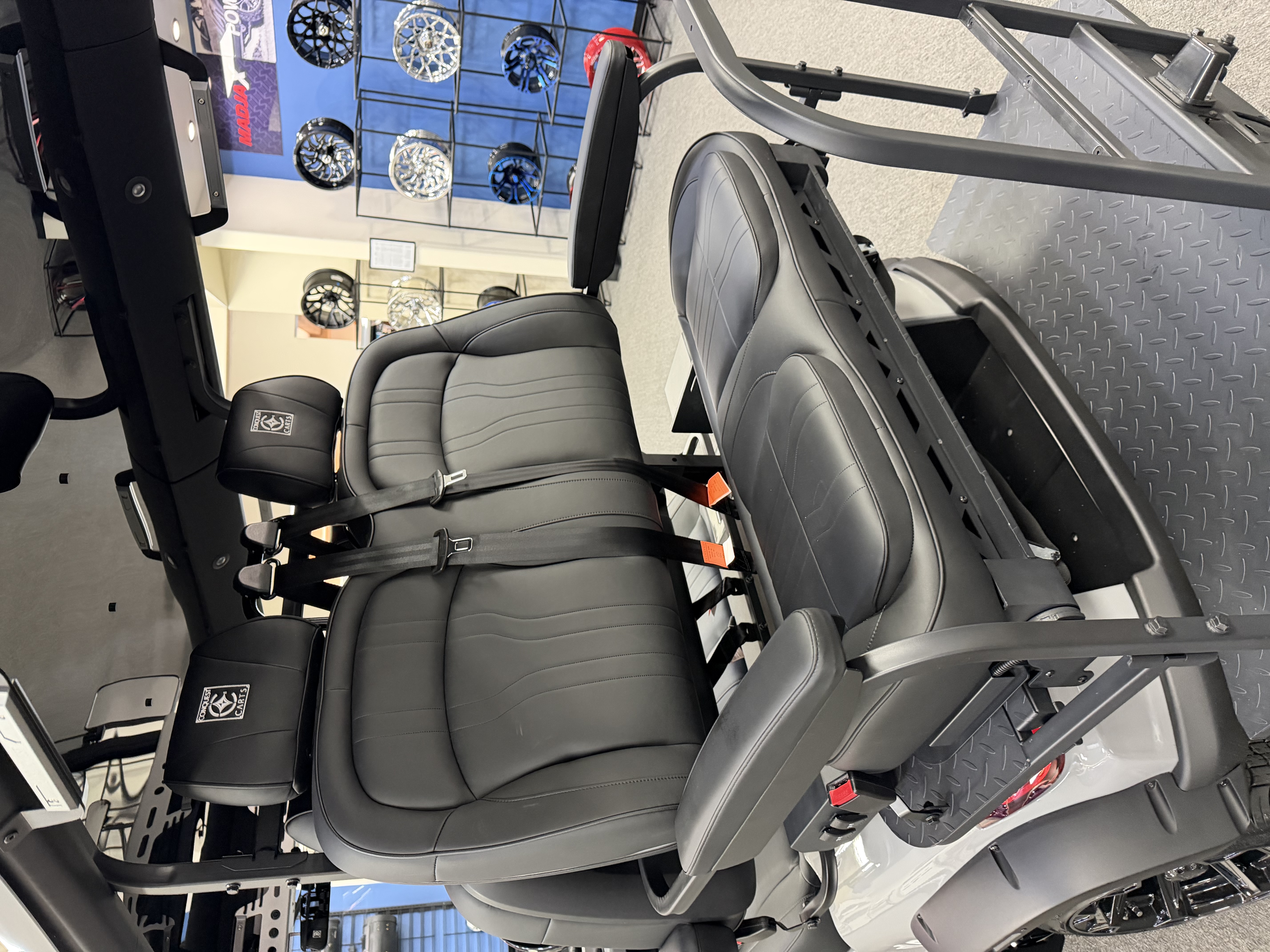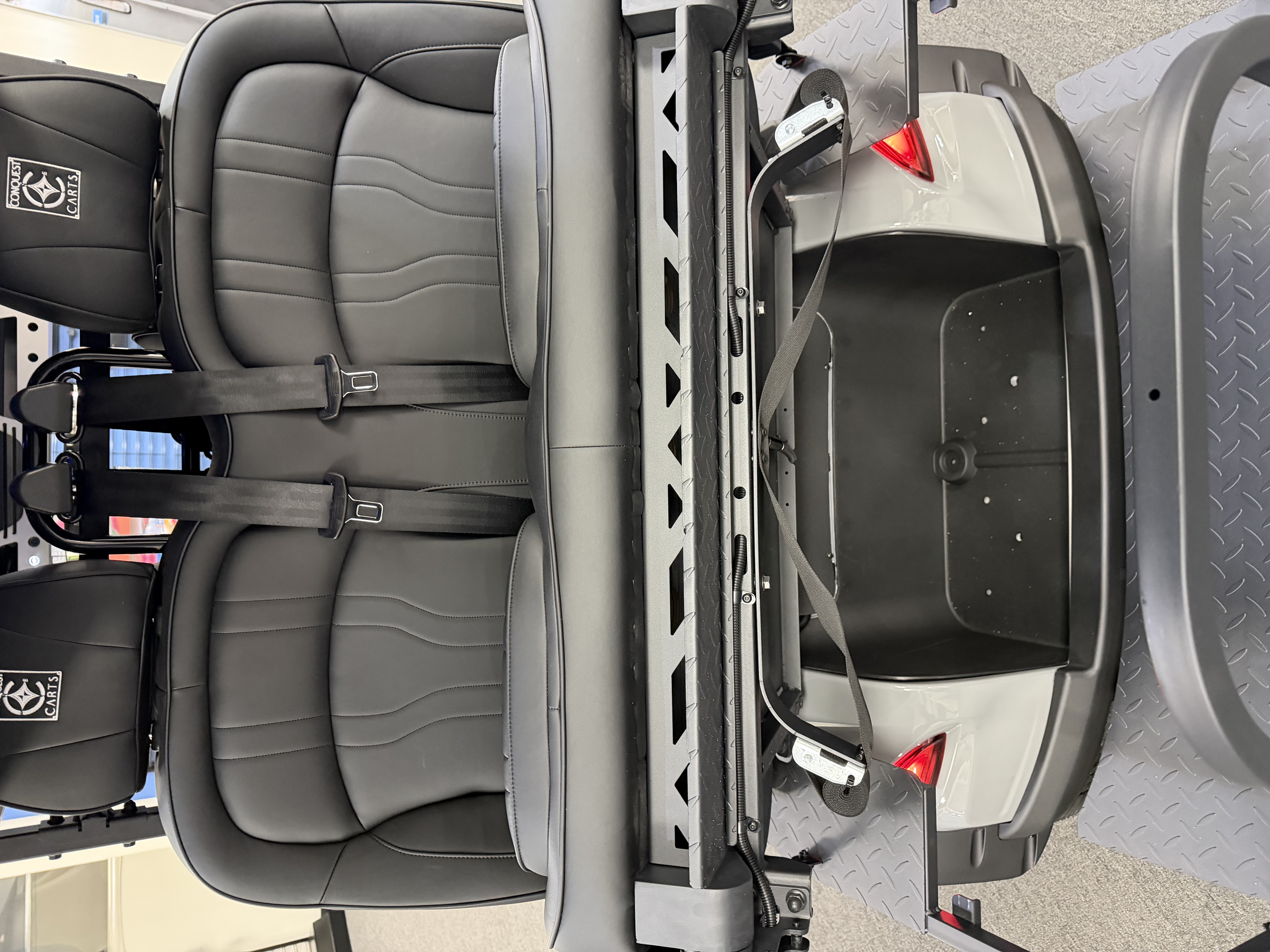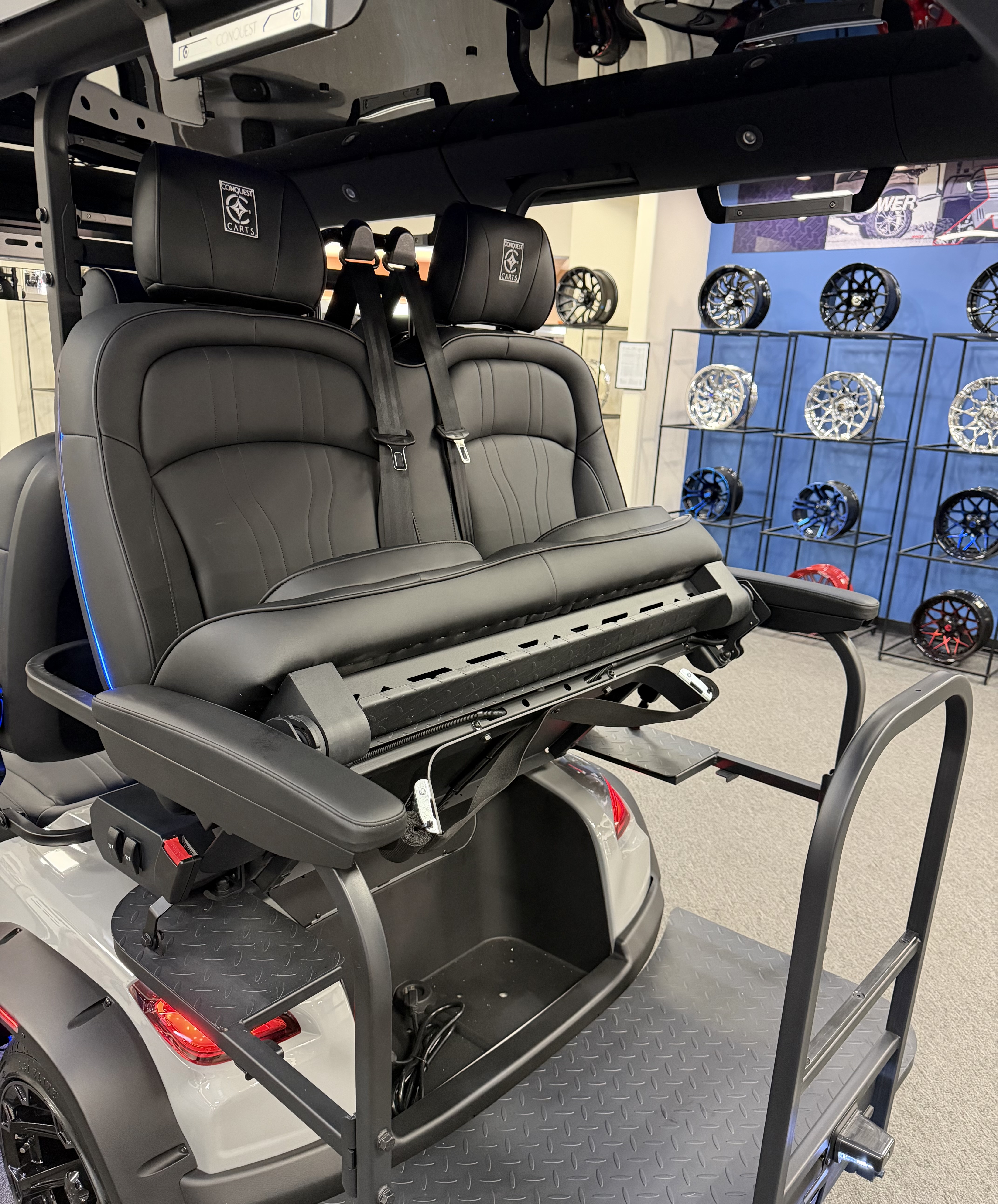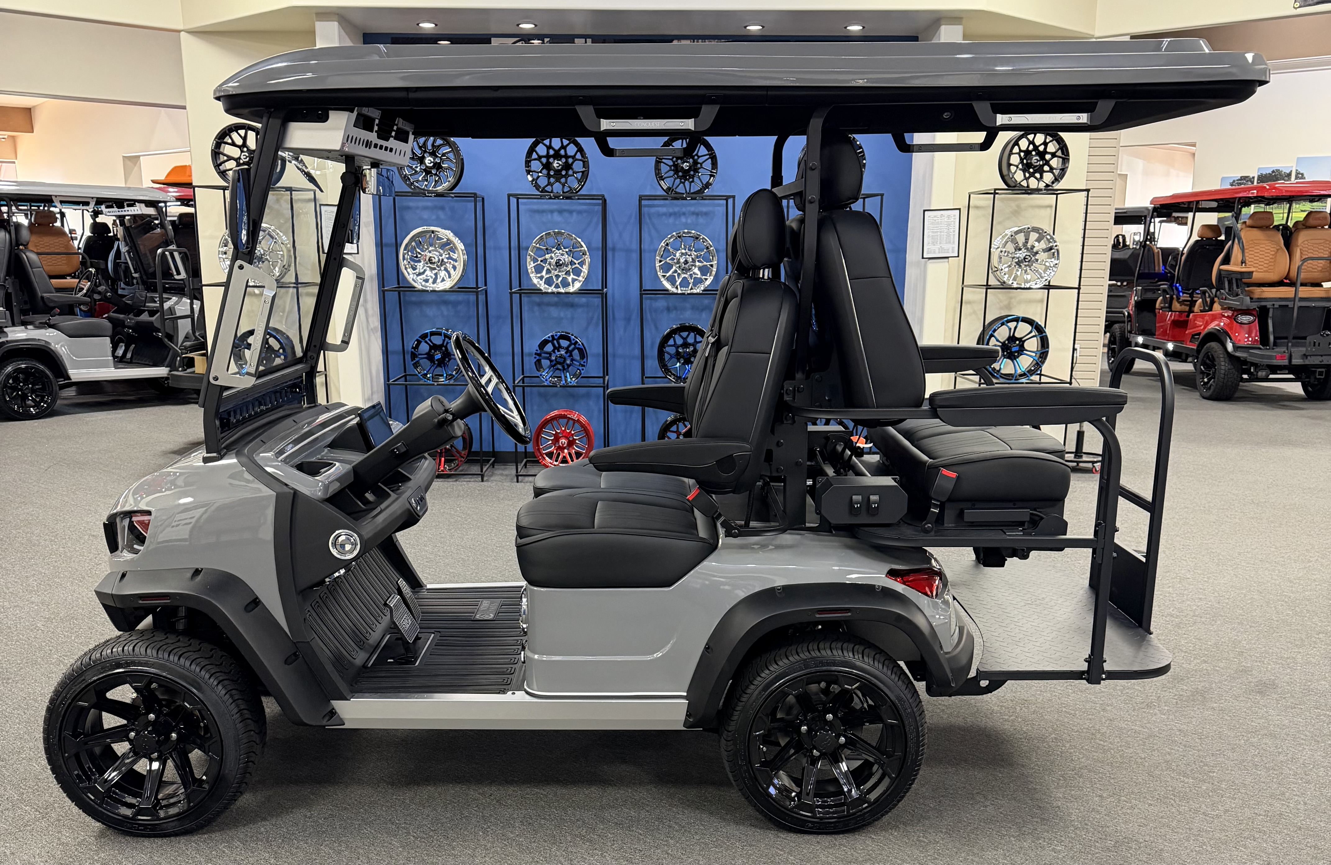 2026 Conquest S40, Lithium Battery ( 5 Year Full Replacement ), 10” Rotating Entertainment Touch Screen, Backup Camera, Apple/Android Carplay, Wireless Phone Charging, Voice Controlled Ambient Lights, Infinity Starlight Roof, Power Rear Lifting Seat With Golf Bag Package, LED Side Mirrors, 4 Mount Speakers with Subwoofer, Keyless/Push Button Start, Heated Front Seats, Power Adjustable Steering Wheel, Adjustable Arm Rest, In-dash Umbrella Holder, Custom 14” Wheels.
