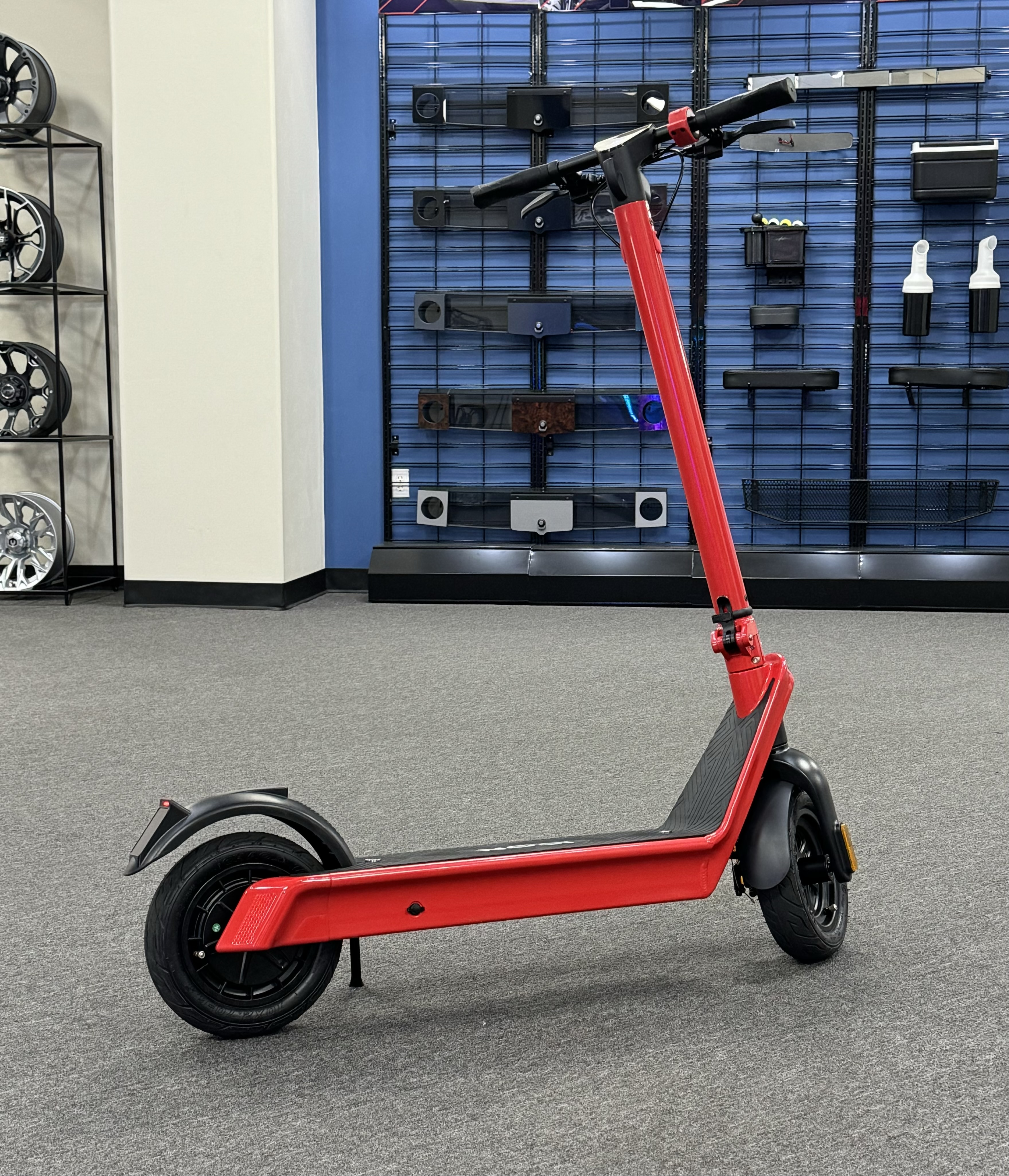 Icon ES04 E-Scooter. 46” Tall. Rear Wheel Drive with a 500W Hub Motor. 15 Amp Hour Lithium Battery. Dual Disc Brakes. Foldable. Headlights and Brakelights. Removable Battery Pack. Folds in Half for Easy Storage. Top Speed 20 MPH. Includes a Custom Helmet. 6 Different Color Options.